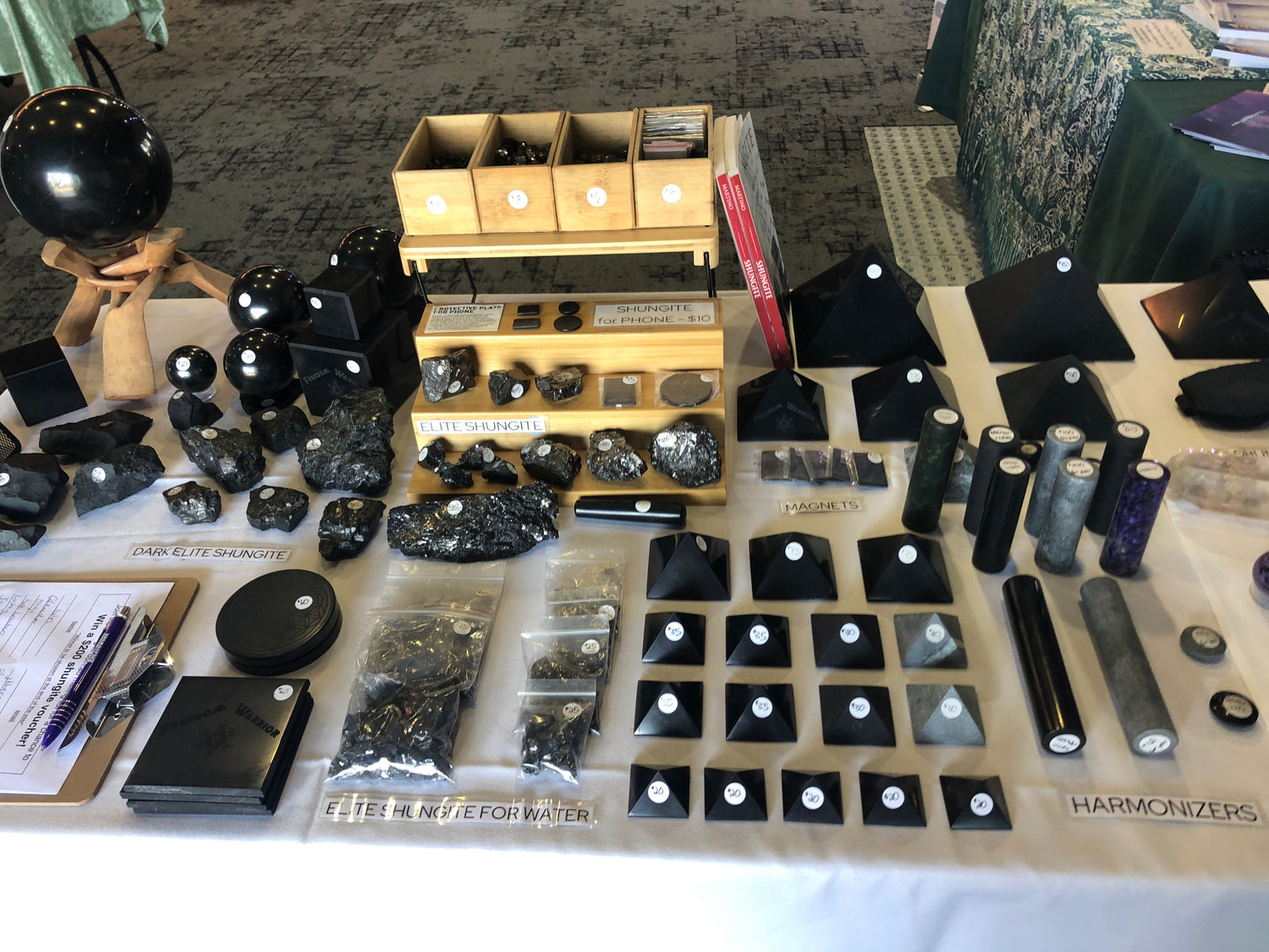 A couple came by the stall, the woman was interested in learning about Shungite but the man was not, and he did not want to be at a crystal stall (I sell crystals at the markets as well as Shungite). The woman decided that they needed them for their phones, and the man said, ‘Fine, give me the smallest one.’ I put it on his phone, and off they went. The next week, the man came back to my stall on his own and went straight to the pendant board. I asked him if he liked the one on his phone, he said that his phone literally feels different and that he needed to wear a piece of Shungite! Now, when I see him at the markets, he is always wearing his pendant.